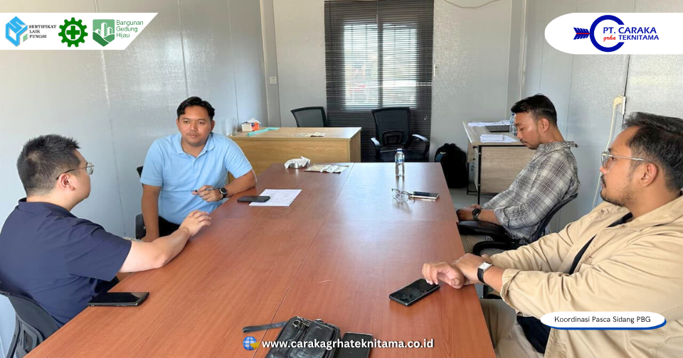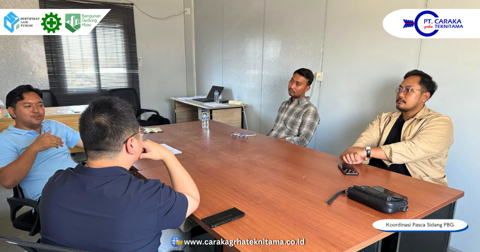 Koordinasi pasca Sidang Persetujuan Bangunan Gedung (PBG) merupakan salah satu tahap penting dalam memastikan seluruh proses pembangunan berjalan sesuai standar teknis dan ketentuan peraturan. Pada tanggal 2 Oktober 2025, telah dilaksanakan koordinasi antara PT Caraka Grha Teknitama selaku konsultan bangunan gedung dengan perwakilan Owner PT Shuhan Packaging Indonesia. Pertemuan ini berlangsung di area Site Office PT Shuhan Packaging Indonesia, menyusul pelaksanaan Sidang PBG yang sebelumnya diadakan bersama Tim Profesi Ahli (TPA) dan Tim Penilai Teknis (TPT) Kabupaten Kendal di kantor DPMPTSP Kabupaten Kendal.