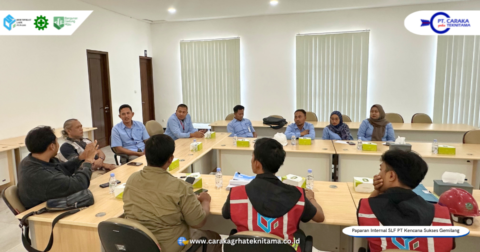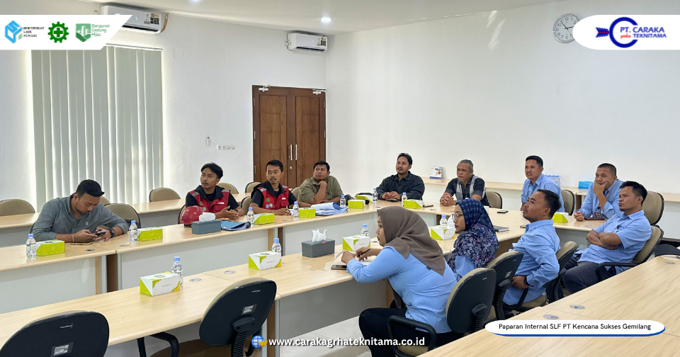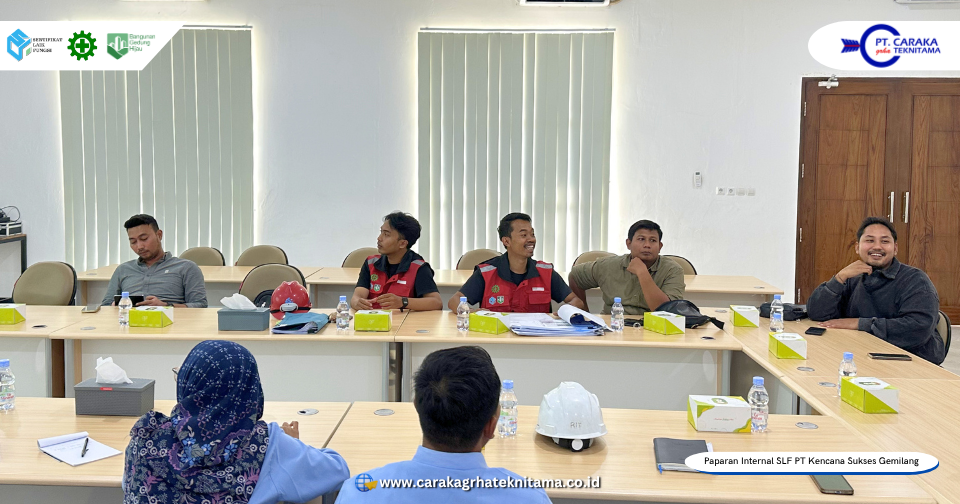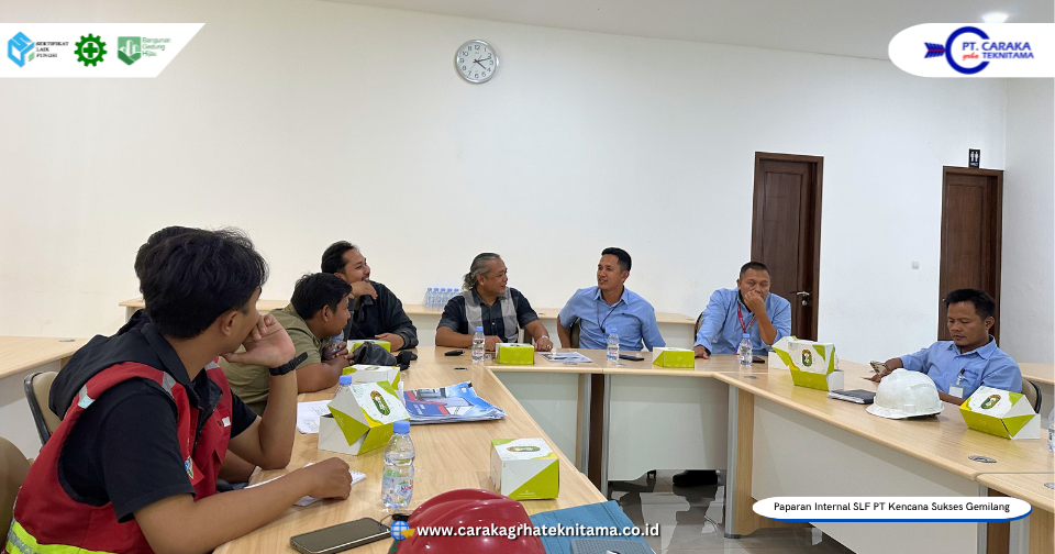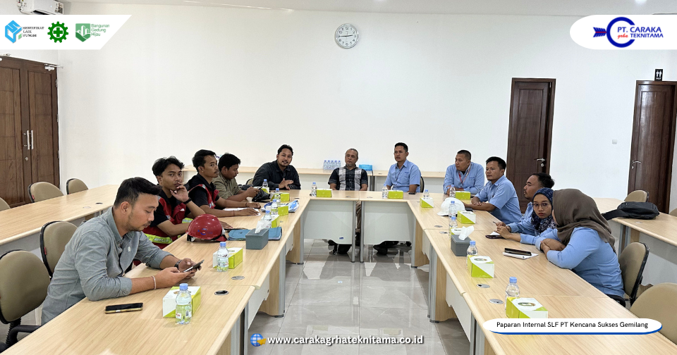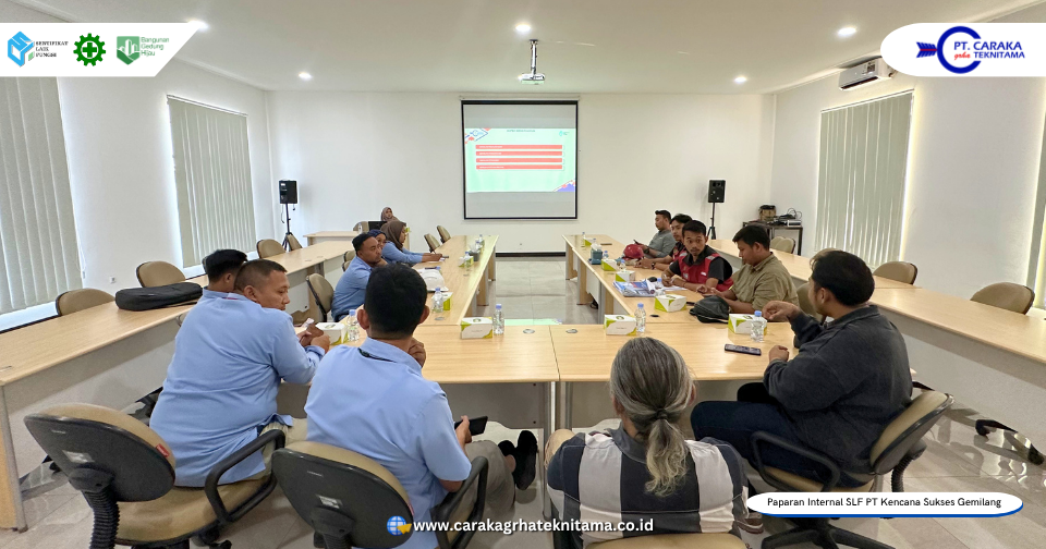 Paparan internal dokumen kajian teknis Sertifikat Laik Fungsi (SLF) bangunan gedung PT Kencana Sukses Gemilang dilaksanakan di Ruang Meeting PT Kencana Sukses Gemilang, yang beralamat di Jl. Sawojajar No.1, Kawasan Industri Kendal, Tambak, Wonorejo, Kecamatan Kaliwungu, Kabupaten Kendal, Jawa Tengah. Kegiatan ini dihadiri oleh Direktur Utama, Direktur Operasional, Tim Tenaga Ahli, Engineer, serta Administrator Teknik dari PT Caraka Grha Teknitama, bersama dengan jajaran manajemen dan Kepala Teknik PT Kencana Sukses Gemilang. Forum ini menjadi wadah strategis dalam menyelaraskan pemahaman teknis serta memastikan kesiapan dokumen menuju tahapan sidang SLF.