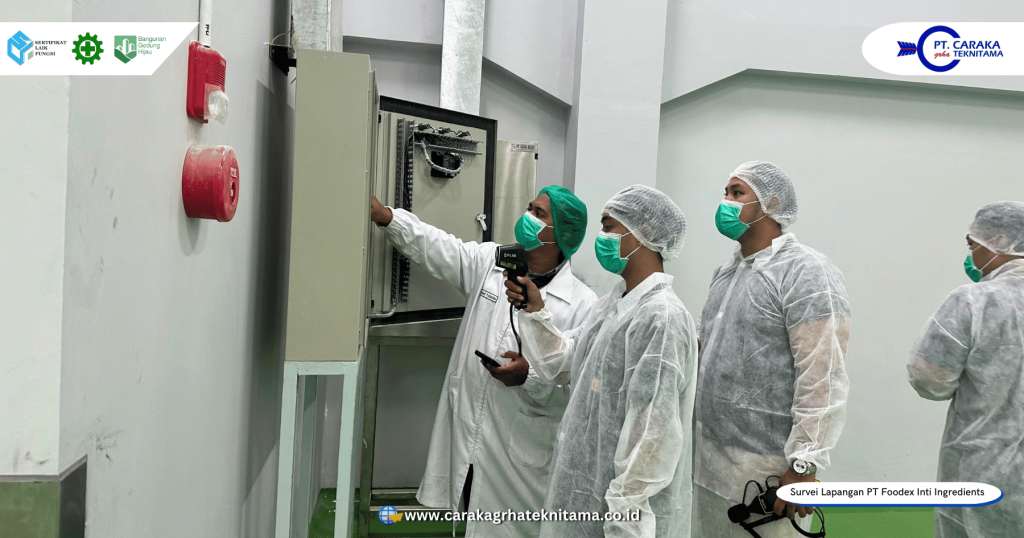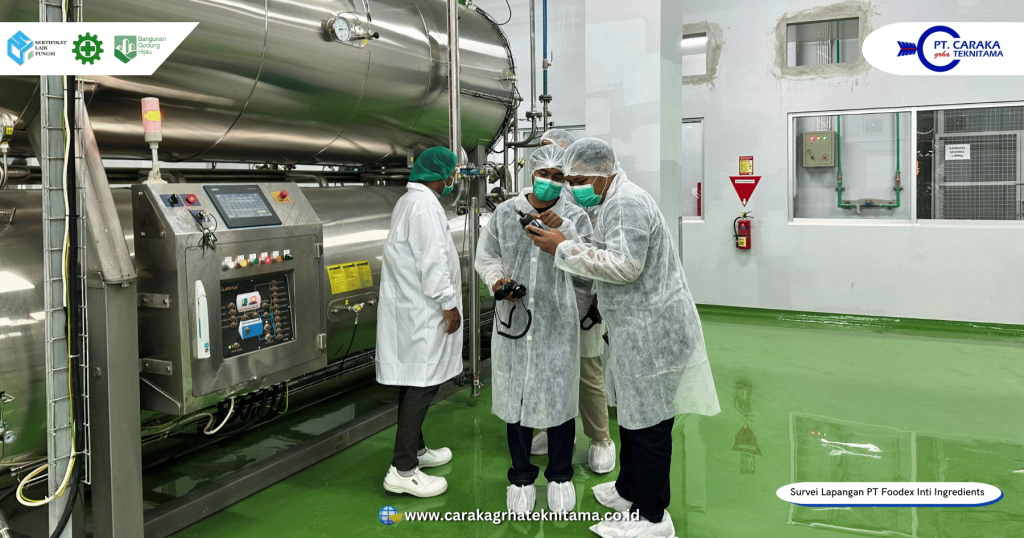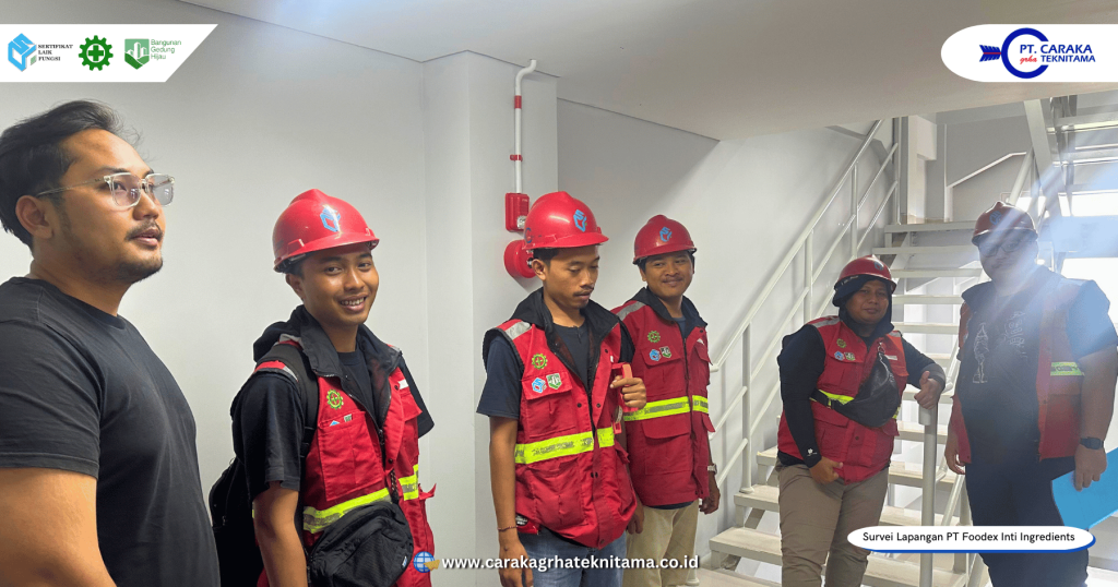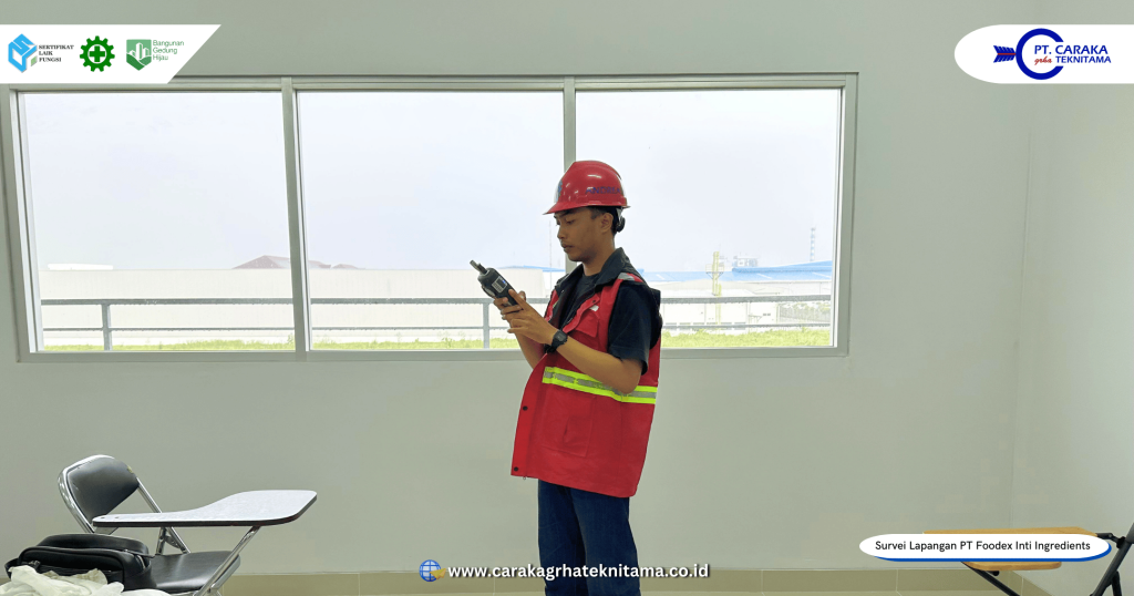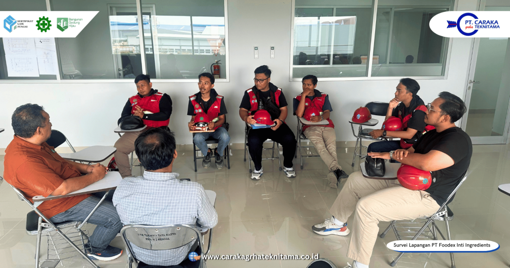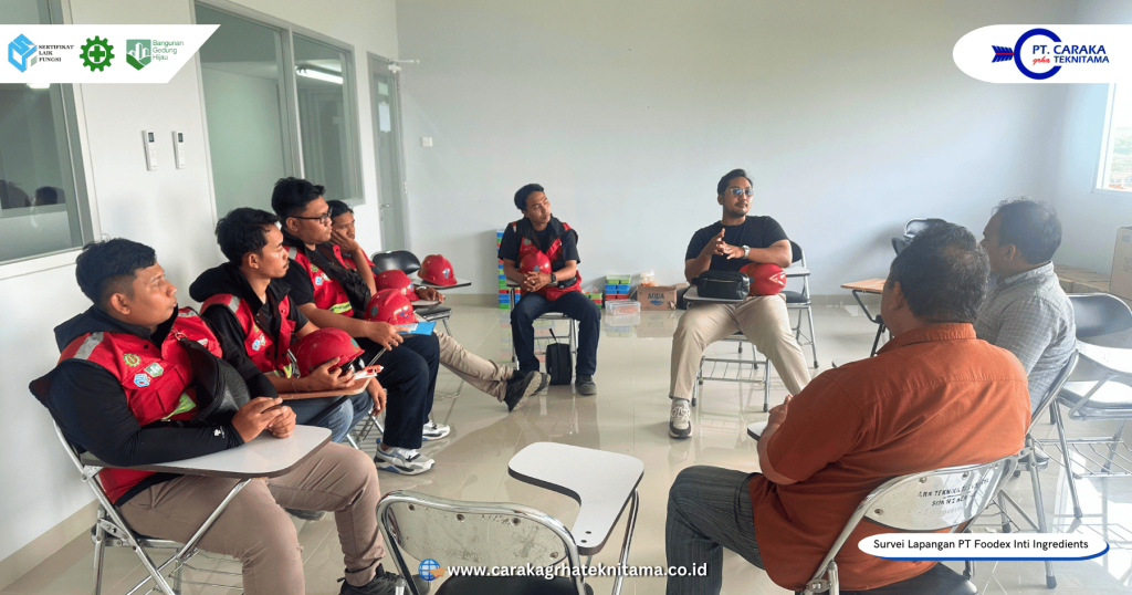PT Caraka Grha Teknitama selaku konsultan yang dipercaya oleh PT Foodex Inti Ingredients dalam proyek penerbitan SLF, melaksanakan survei lapangan dan pengujian teknis secara komprehensif dan sistematis. Kegiatan diawali dengan koordinasi pra-survei yang membahas pembagian area serta penetapan objek pengujian, sehingga seluruh proses dapat berjalan efektif dan sesuai dengan rencana pengujian yang telah disusun sebelumnya.