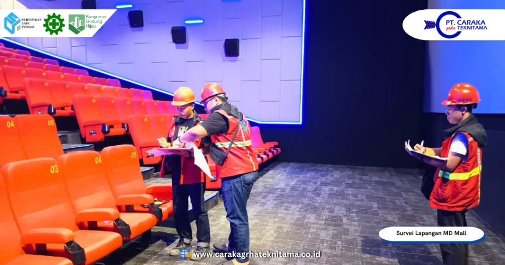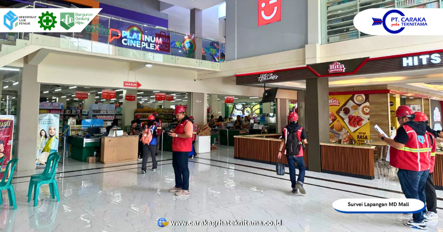 Tahapan survei diawali dengan koordinasi teknis antara Tim Survei PT Caraka Grha Teknitama dan Manajer, Kepala Bagian Operasional dan Teknisi MD Mall. Rangkaian kegiatan meliputi observasi, pengambilan data, pengukuran teknis, pengujian sistem bangunan, serta dokumentasi visual menyeluruh. Pada aspek arsitektur, tim menilai fungsi ruang, tata letak, jalur evakuasi, fasilitas kebakaran, area luar bangunan, hingga ruang-ruang pendukung seperti warehouse dan office. Seluruh temuan didokumentasikan sebagai bahan verifikasi dan penyusunan gambar ulang.