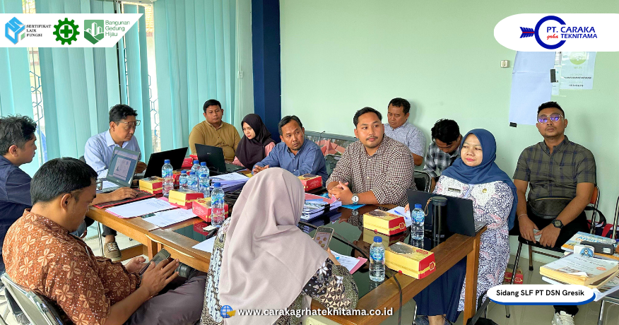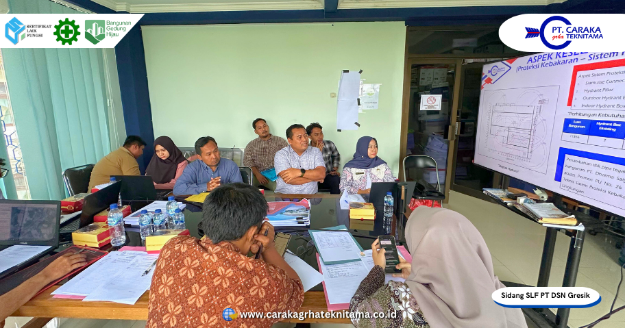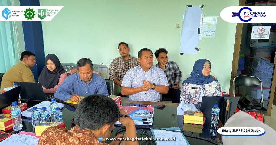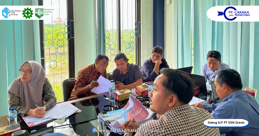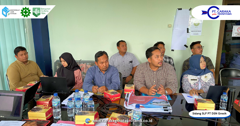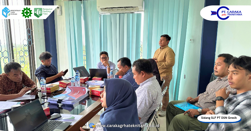 Sidang Sertifikasi Laik Fungsi (SLF) bagi bangunan PT Dharma Satya Nusantara (DSN) Tbk. Gresik digelar pada 20 November 2025 di Ruang Rapat Dinas Cipta Karya, Perumahan dan Kawasan Permukiman Kabupaten Gresik. Agenda ini dihadiri Direktur Operasional, Tim Tenaga Ahli, Administrator Teknik, serta Tim Teknis PT Caraka Grha Teknitama yang memperoleh mandat sebagai konsultan penyusun Dokumen Kajian Teknis untuk memenuhi persyaratan penerbitan SLF PT DSN. Hadir pula perwakilan Owner PT Dharma Satya Nusantara Gresik, unsur Dinas Pekerjaan Umum dan Tata Ruang Kabupaten Gresik, serta Tim Profesi Ahli (TPA) dan Tim Penilai Teknis (TPT) sebagai unsur penilai utama.