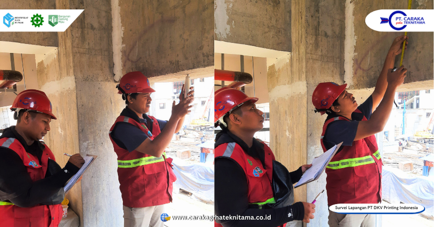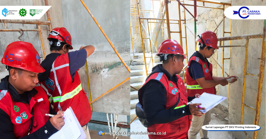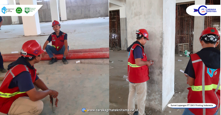 PT DKV Printing Indonesia saat ini memiliki enam gedung utama yang sedang dalam tahap konstruksi, dengan pelaksana pekerjaan konstruksi adalah PT China Construction Yangtze River Indonesia selaku kontraktor. Dalam konteks tersebut, survei lapangan difokuskan pada pemeriksaan dan pengujian bangunan Raw Warehouse 1, Raw Warehouse 2, serta Gedung Produksi. Pengujian struktur beton dilakukan melalui metode hammer test, pengukuran dimensi kolom dan balok, disertai dengan pengecekan instalasi plumbing dan persiapan instalasi sistem MEEP, guna memastikan kesesuaian mutu pelaksanaan terhadap perencanaan dan spesifikasi teknis.